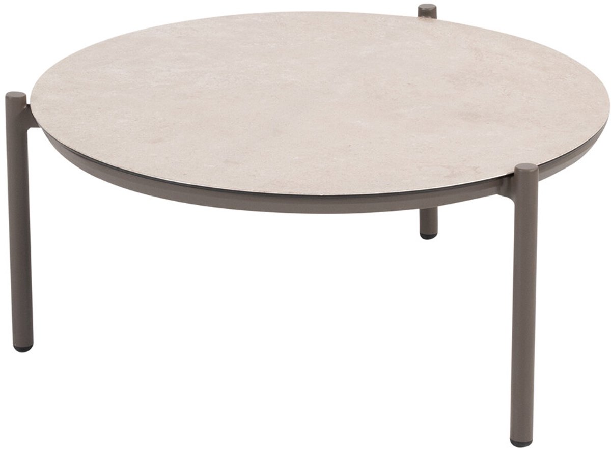 De Vic loungetafel heeft een ronde vorm tafelblad met drie tafelpoten. Het tafelblad heeft een uitstraling van keramiek en een terre kleurig frame. De loungetafel is goed te combineren met verschillende loungemeubelen met een terre kleurig frame.