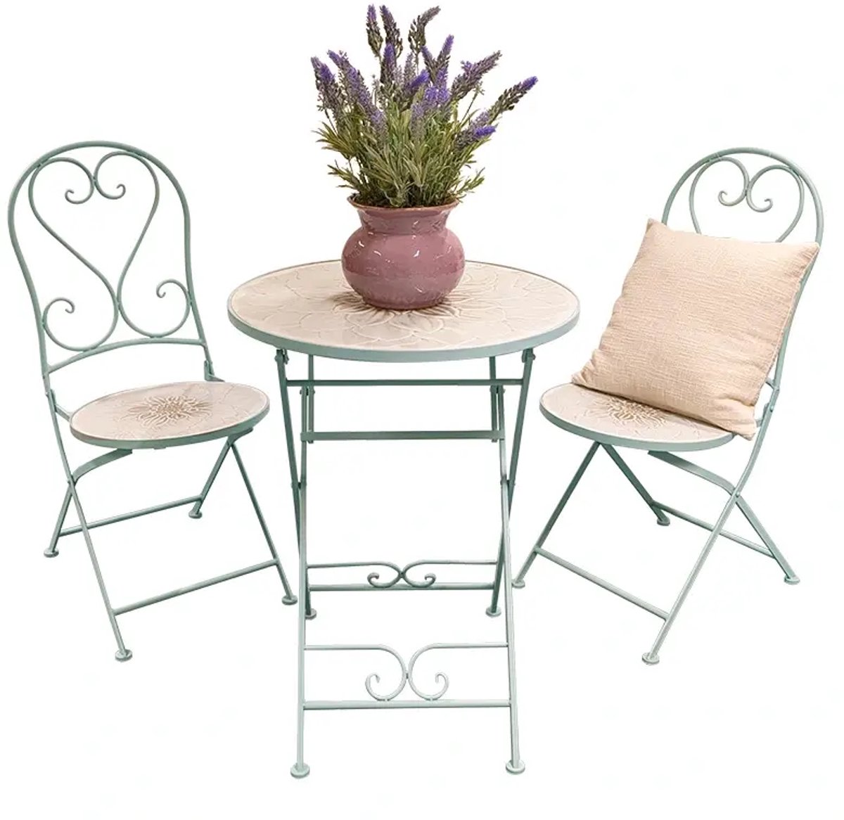 De Bistroset Lausanne heeft een prachtige uitstraling! De bistroset bestaat uit een ronde tafel met 2 stoelen.De tuinmeubelen zijn allemaal inklapbaar waardoor de bistroset gemakkelijk op te bergen is.De meubels zijn gemaakt van metaal en mozaïek.LET OP: de set wordt geleverd exclusief accessoires. Afmetingen (cm)Stoel: B39 x D51 x H93Zitting: D38 x H46Tafel: Ø58 x H76 lees meer over dit product