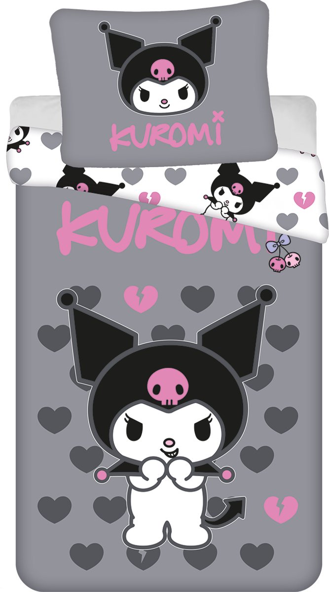 Dit stoere maar supercute 1-persoons Kuromi dekbedovertrek is perfect voor de fans van Sanrio's meest eigenzinnige meisje met een randje. Op de grijze achtergrond is Kuromi te zien, omringd door hartjes. Het overtrek is dubbelzijdig bedrukt, dus je kunt afwisselen tussen twee leuke designs! Of je nu lekker wilt chillen, dagdromen of in stijl onder de wil kruipen; met Kuromi in de hoofdrol wordt slapen een feestje. De set is gemaakt van 100% katoen, wat heerlijk zacht aanvoelt. Het bijgeleverde extra grote kussensloop zorgt voor optimaal comfort. Zoek je een origineel en stijlvol cadeau? Dit dekbedovertrek is een schot in de roos voor verjaardagen, slaapfeestjes of gewoon als verrassing voor een echte Kuromi-fan!