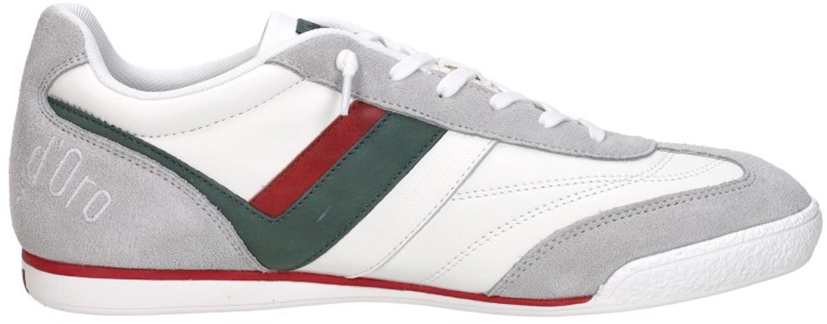 Pantofola d'Oro sneakers voor hem. De sneakers zijn gemaakt van hoogwaardig leer en textiel. De sneaker heeft een uitneembare EVA binnenzool, wat zorgt voor een lekkere demping. Merk: Pantofola d'Oro Modelnaam: Vasto Categorie: heren sneakers Materialen: leer en textiel Kleur: wit, groen, rood lees meer over dit product
