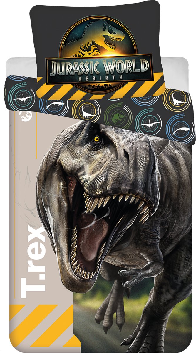 Dino-liefhebbers opgelest! Bedtijd wordt een avontuur met dit spectaculaire Jurassic World dekbedovertrek. Midden op het overtrek staat een levensechte en superstoere T-Rex afgebeeld; DE T-Rex uit de beroemde filmserie van Jurassic World! Op het extra grote kussensloop (70 x 90 cm) prijkt het iconische Jurassic World logo, zodat je kind zicht elke avond midden in het dino-avontuur waant. De set is dubbelzijdig bedrukt, dus je ... lees meer over dit product