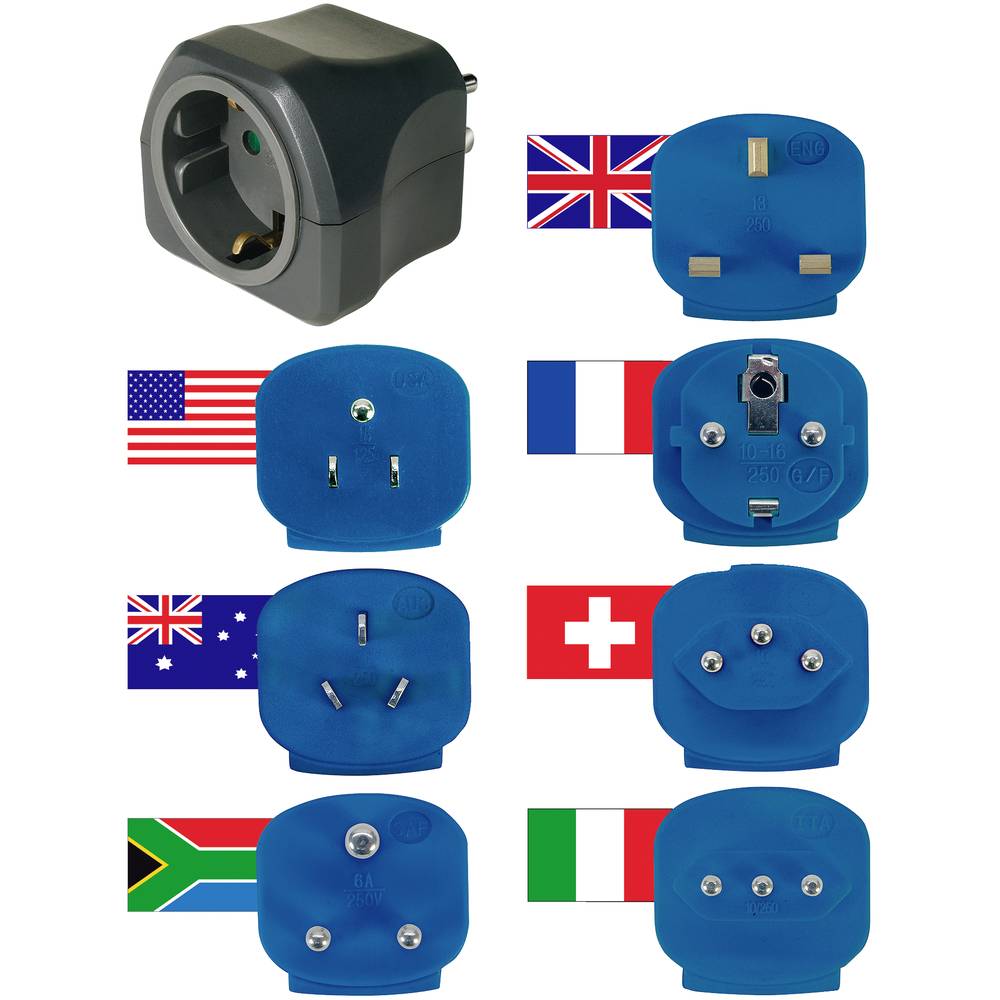 Deze reisstekker set bestaat uit 7 versies voor gebruik in meer dan 150 landen. Een veilige, universele netadapter waarmee elektrische apparatuur met een Europese stekker kan worden aangesloten op andere aansluitingen in het buitenland.