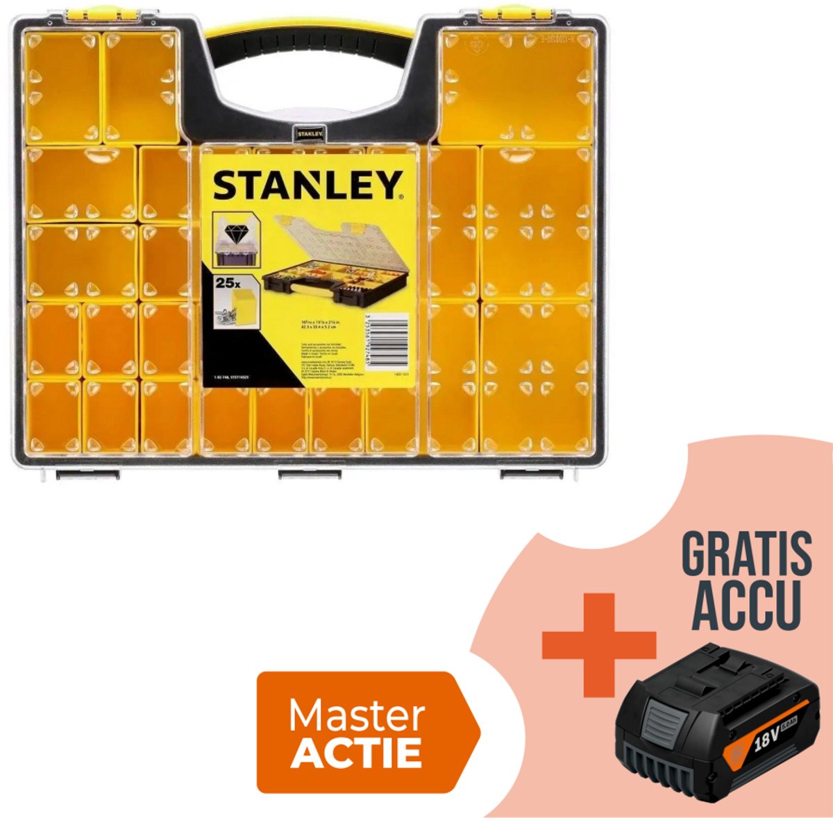 Deze Stanley organizer is een handige opbergoplossing voor al uw kleine onderdeeltjes. Met 25 uitneembare vakjes kunt u uw benodigdheden eenvoudig sorteren en ordenen. Nooit meer zoeken naar die verloren schroef of moer!