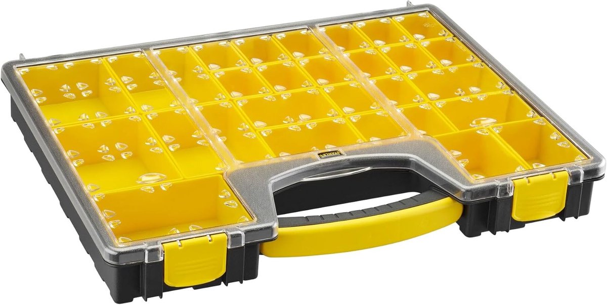 Het comfortabele handvat zorgt voor moeiteloos transport, terwijl het doorzichtige, schokvaste deksel ervoor zorgt dat u snel kunt zien wat er in de vakjes zit. Geen gedoe meer met zoeken naar het juiste onderdeel!