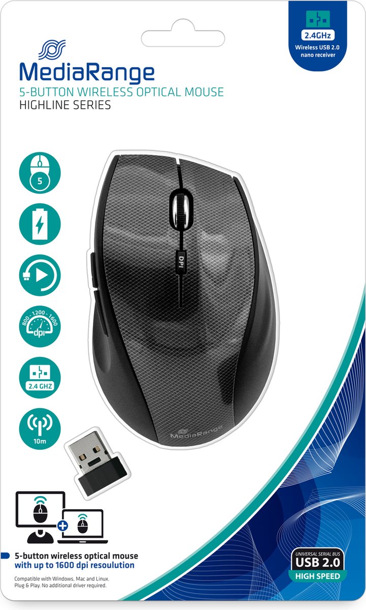 De MediaRange 5-button optische draadloze muis is binnen enkele seconden geinstalleerd op je PC of Mac. De ideale muis voor thuis of op kantoor.