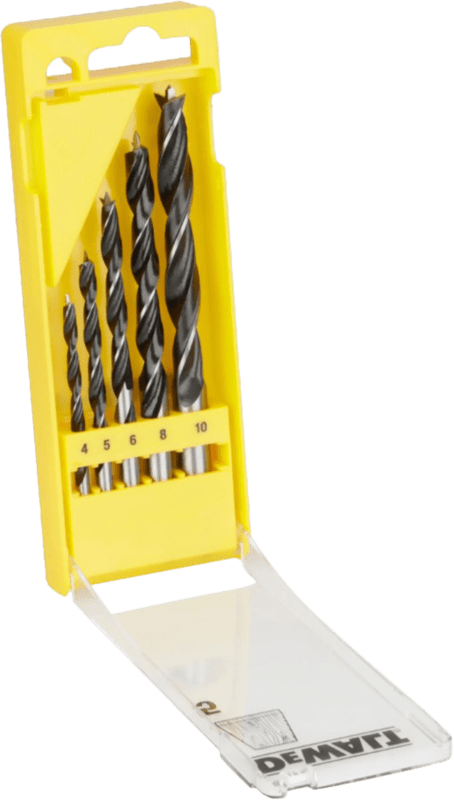 De set bevat een assortiment aan verschillende maten, waaronder een 4.0x80 mm, 5.0x90 mm, 6.0x100 mm, 8.0x120 mm en 10.0x133 mm houtboor. De handige cassette zorgt ervoor dat u de boren altijd georganiseerd en makkelijk bij de hand heeft.