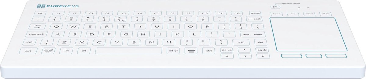 Met het Purekeys Touchpad Medisch Toetsenbord geniet je van een comfortabel typgevoel en de optimale hygiëne van een volledig vlak toetsenbord. Het grote touchpad is handig op plekken waar het gebruik van een muis niet mogelijk of niet gewenst is. De hoogwaardige siliconen toplaag is zeer snel en eenvoudig schoon te maken met een doekje. Bij het schoonmaken drukt u op de speciale ‘cleankey’ en het toetsenbord wordt uitgeschakeld zodat u niks intypt tijdens het schoonmaken. Dit toetsenbord is uitermate geschikt voor ziekenhuizen en tandartsen.
