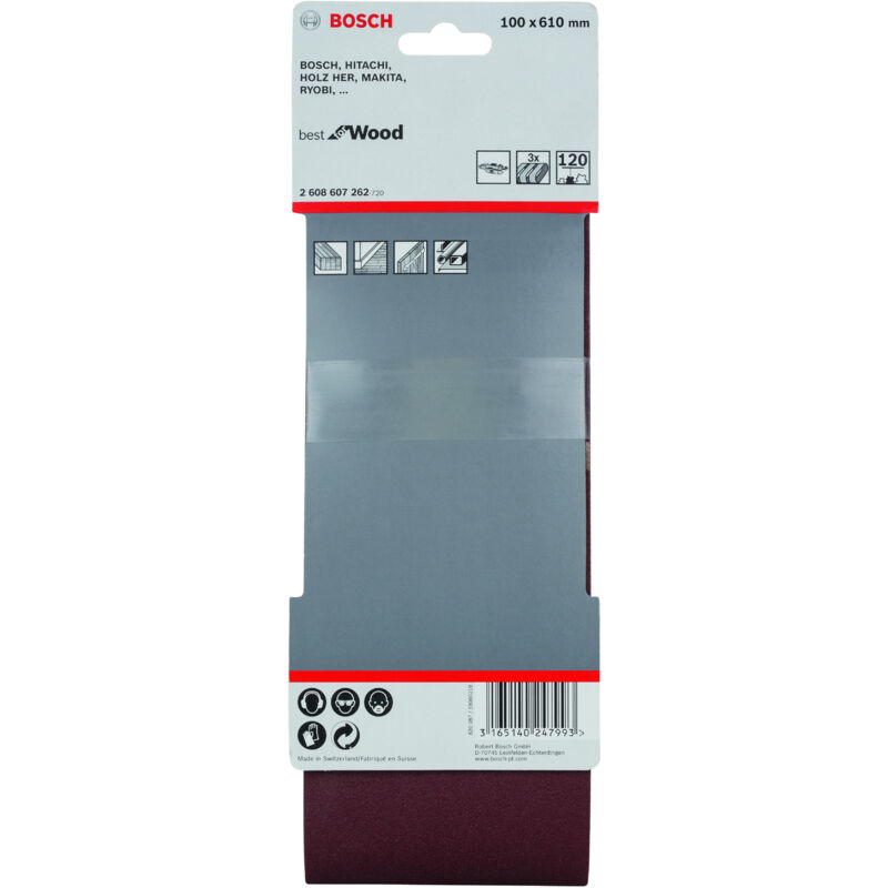 Deze bijzondere set van 3 schuurbanden is speciaal ontworpen voor het schuren van hout en verf. Met een afmeting van 100 x 610 mm en een korrelgrootte van 120, zorgen deze banden voor een perfect glad oppervlak. De banden passen op verschillende merken schuurmachines, waaronder Bosch, Hitachi, Holz-Her, Makita, Ryobi en Wegoma.