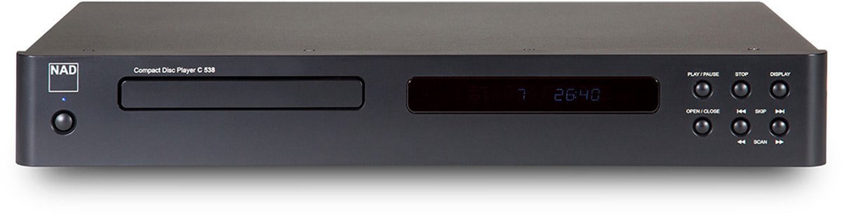 NAD C 538. Signaal/ruis-verhouding: 110 dB, Totale harmonische vervorming (THD): 0,01 procent, Ondersteund audioformaat: MP3,WMA. Playback disc formaten: Cd-audio. Beeldscherm: VFD. Typisch stroomverbruik: 7,5 W, Stroomverbruik (in standby): 0,5 W. Diepte: 249 mm, Hoogte: 70 mm, Breedte: 435 mm