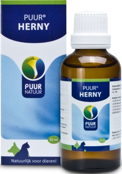 PUUR Herny bevat een verdund extract van Sint Janskruid en valkruid. Deze natuurlijke ingrediënten hebben verschillende eigenschappen die bijdragen aan de gezondheid van het zenuwstelsel en de tussenwervelschijven. Valkruid bevat stoffen die helpen ter bescherming van gezonde cellen en goed zijn voor de zenuwen. Sint Janskruid werkt ontspannend en heeft een celbeschermend effect. Samen zorgen deze ingrediënten ervoor dat de prikkeloverdracht tussen de cellen wordt bevorderd en dat uw huisdier weer soepel kan bewegen.