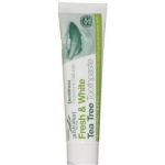 Ervaar de krachtige werking van Tea tree olie, in combinatie met Aloe Vera, Co-Q10 en paardenkastanje, met Australian Tea Tree Tandpasta Fresh & White. Deze tandpasta verwijdert niet alleen tandplak en remt bacteriën, maar het helpt ook bij het voorkomen van tandvleesontsteking en zweertjes in de mond. En het beste van alles? De enige aroma gebruikt in deze tandpasta is natuurlijke pepermuntolie.