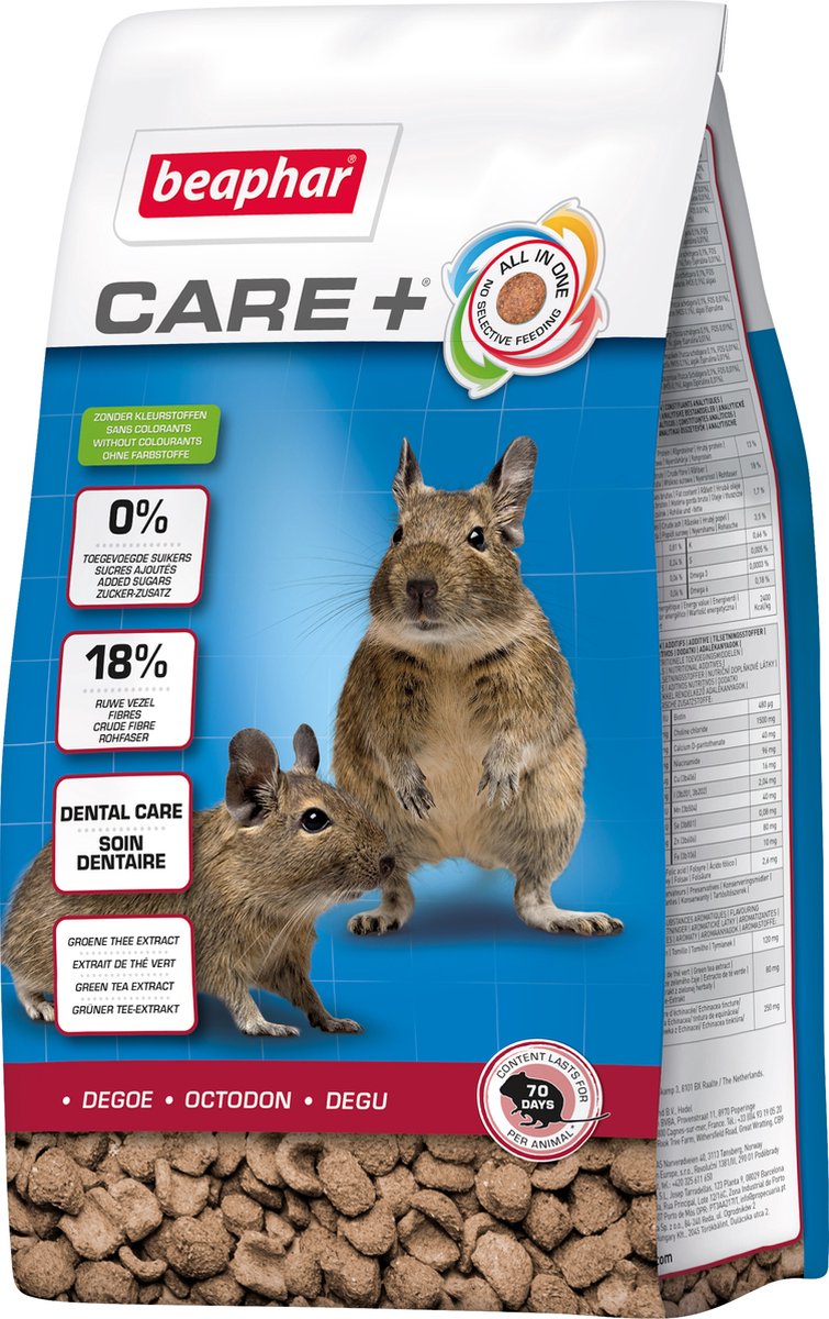 Beaphar Care+ DegoeDeze voeding bevat een hoger ruw vezelgehalte (19%),een op degoes afgestemd vetpercentage en er zijn geen suikers toegevoegd. Ieder brokje heeft dezelfde samenstelling (All-in-One) wat belangrijk is voor een uitgebalanceerde voeding (geen selectief eetgedrag en restjes meer). De hardere geëxtrudeerde brokjes bevorderen de slijtage van de tanden (Dental Care). Het voer bevat geen kunstmatige kleurstoffen meer, wat beter is voor de gezondheid en verteerbaarheid van het dier. * Groene thee extract stimuleert en ondersteunt het immuunsysteem * Met Echinacea * Gecheleerde mineralen voor een betere mineralenopname * FOS en MOS voor een goede ondersteuning van de darmflora * Omega 3 en 6 * Bevorderd gebitsslijtage