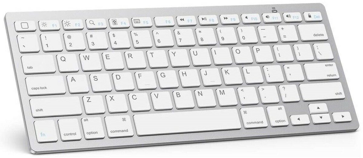 Universeel draadloos bluetooth toetsenbord voor vrijwel alle modellen tablets, computers, laptops en zelfs uw smart tv. Dit stijlvolle, zilverkleurige keyboard is ergonomisch ontworpen, ultraslank, lichtgewicht en heeft dankzij de hoogwaardige Bluetooth V3.0 technologie een werkbereik van liefst 10 meter.