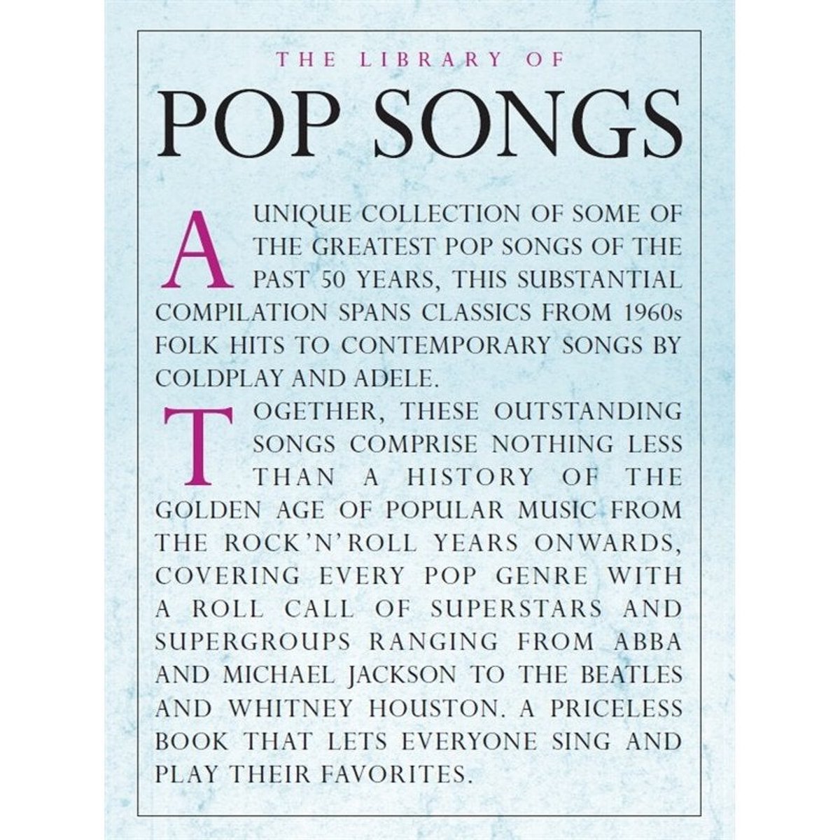 (Piano/Vocal/Guitar Songbook). A unique collection of some of the greatest pop songs of the past 50 years, this substantial compilation spans classics from 1960s folk hits to contemporary songs by Coldplay and Adele. Taken together, these outstanding songs comprise nothing less than a history of the golden age of popular music from the rock 'n' roll years onwards, covering every pop genre with a roll call of superstars and supergroups ranging from ABBA and Michael Jackson to Oasis and Whitney Houston. A priceless book that lets everyone sing and play their favorites.