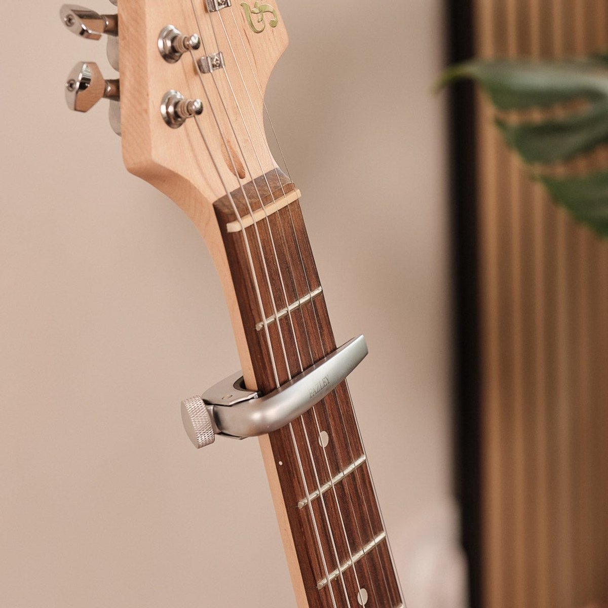 De Fazley C1E is een zilveren, gebogen capo die door middel van een schroefknop zeer gemakkelijk in gebruik is. Deze capodaster is te gebruiken op elektrische en akoestische westerngitaren. lees meer over dit product