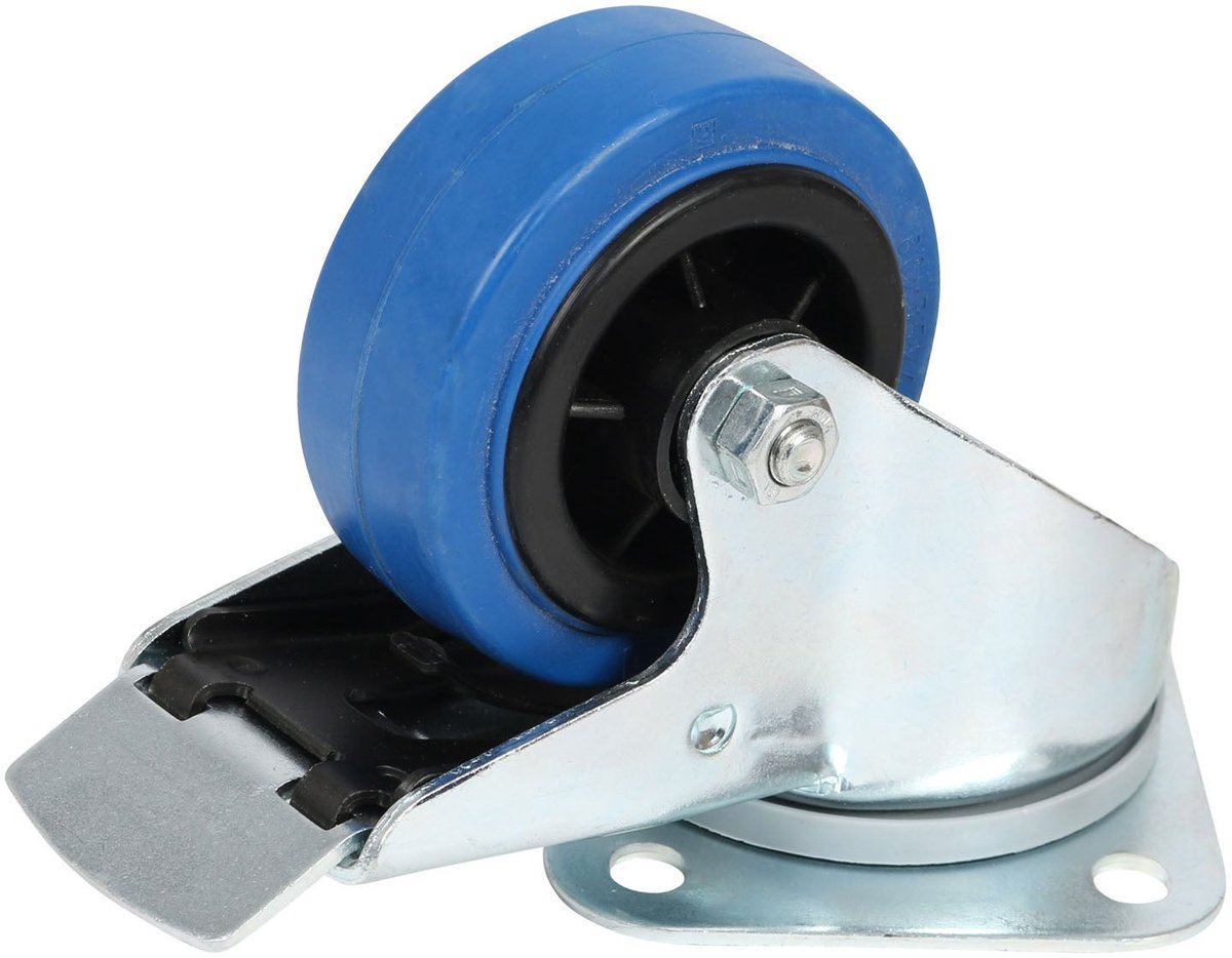 Dit blauwe zwenkwiel is voorzien van een dubbele rem. Zo weet je zeker dat je zware lading precies blijft waar jij wilt. Dankzij de dubbele kogeldraaikrans in de zwenkkop kun je eenvoudig alle kanten op sturen.