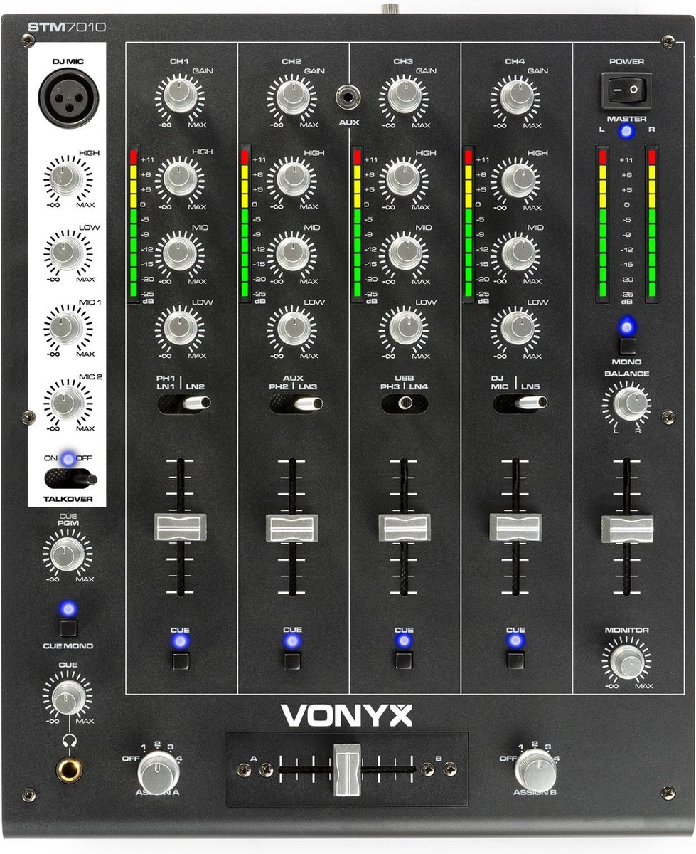 De STM-7010 van SkyTec is de perfecte clubmixer om mee te beginnen. Met vier kanalen, een crossfader en voldoende aansluitingen biedt deze DJ mixer alle gemakken die je als beginner nodig hebt. Je kunt drie apparaten aansluiten via phono en hebt vijf line-ingangen. Daarnaast is er een schakelbare ingang tussen de twee. Met drie microfooningangen, waarvan één met een eigen tweebands EQ en talkover-functie, ben je altijd voorzien van de benodigde controle. Op de bovenkant van het mengpaneel vind je ook een handige AUX-ingang voor het aansluiten van een 3.5mm jack op bijvoorbeeld een mediaspeler.