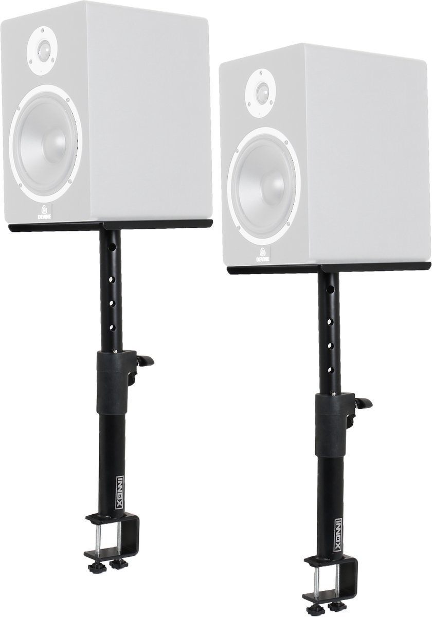 De Innox IVA MON-08 desktop monitor statieven met klem (set van 2) zijn perfect om je monitors stevig op je bureau te bevestigen. Geschikt voor de meeste studio workstations en bureau's. In hoogte verstelbaar van 28 tot 47.5 cm voor optimale luisterpositie. Stevig platform met 23 x 23 cm plateau en draagvermogen van 15 kg per stuk.