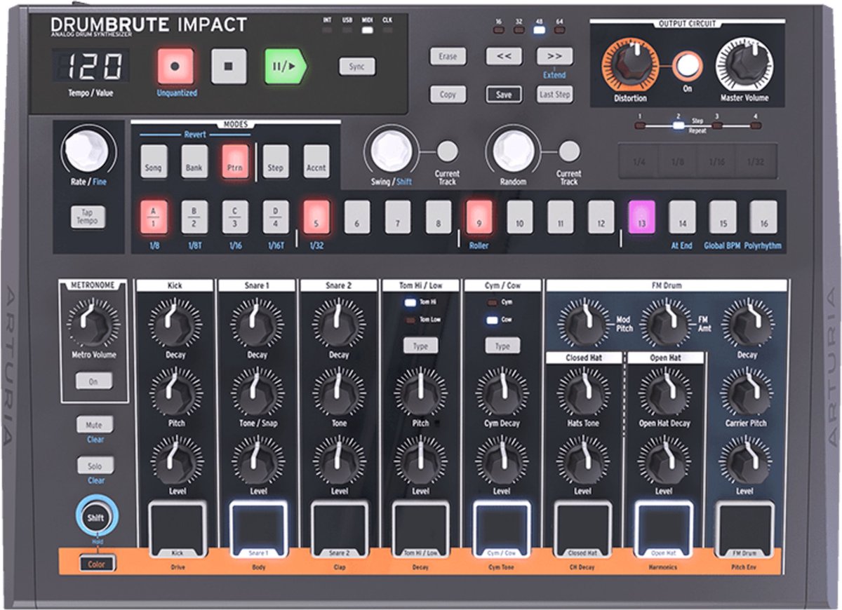 De Arturia DrumBrute Impact is een krachtige en gebruiksvriendelijke drumcomputer met 10 volledig analoge drumgeluiden en een intuïtieve sequencer. Zonder complexe menu’s pas je elk geluid direct aan met de fysieke knoppen, ideaal voor zowel live-optredens als studioproducties.