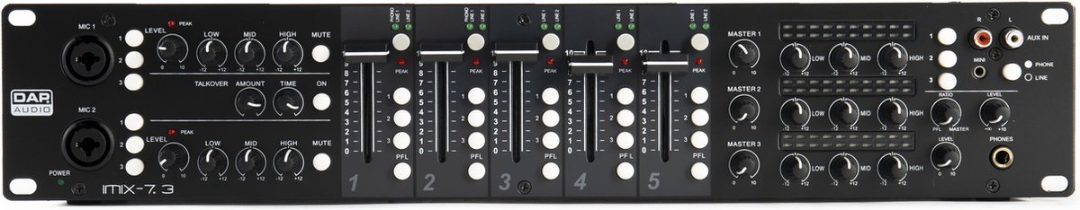 De DAP IMIX-7.3 is een compacte rackmixer met een handige zone controle functie. Deze mixer heeft dezelfde functionaliteit als de IMIX-7.1, maar met de IMIX-7.3 kunnen de ingangen individueel gerouteerd worden naar de gewenste uitgang. Dit betekent dat je met de IMIX-7.3 drie verschillende ruimtes van een eigen mix kunt voorzien, met verschillende muziek, geluidsniveaus en EQ-instellingen.