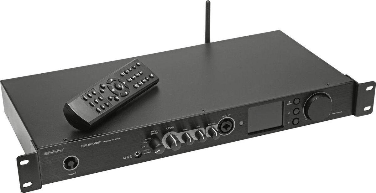Met de platte stereo-ontvanger DDP-900NET hoort u netradio van duizenden, gratis zenders wereldwijd in de beste kwaliteit. De DJP-900NET ondersteunt bovendien de digitale radio DAB+, die veel voordelen heeft ten opzichte van de oude FM. De toekomstbestendige nieuwe radiostandaard in digitale kwaliteit is ruisvrij, onafhankelijk van het internet en beëindigt het lastige zoeken naar frequenties. Verbind het apparaat hiervoor eenvoudig met uw WiFi-netwerk - u kunt meteen een heldere radio-ontvangst in uw winkel, restaurant of sportschool krijgen. Mocht het radioprogramma u niet toezeggen, dan kunt u de Bluetooth-functie van de ontvanger gebruiken om de muziek draadloos van uw Bluetooth-apparaat over te dragen. De DJP-900NET voldoet bovendien aan de DLNA-standaard en kan uw in het netwerk opgeslagen muziekbibliotheek streamen. Selecteer uw audiobestanden op het dimbare TFT-kleurendisplay eenvoudig en speel de muziek dan via de ontvanger af. De geïntegreerde krachtige Class-D-versterker stelt 2 x 460 watt aan 4 ohm resp. 2 x 240 watt aan 8 ohm beschikbaar en kan muziek van verschillende analoge en digitale bronnen afspelen en regelen. Voor de levering van het dubbele uitgangsvermogen kan hij naar bruggenmodus worden omgeschakeld. Dan wordt een vermogen van 900 watt bereikt. Op de schroefterminals kunnen laagohmige luidsprekers (4-16 ohm) en 100 V ELA-luidsprekers worden aangesloten. Voor andere digitale eindapparaten biedt de DJP-900NET extra Toslink- en coax-aansluitingen. De DJP-900NET kan eenvoudig via de grote jogdial of de meegeleverde afstandsbediening worden bediend. Favoriete zenders kunnen gemakkelijk via een webinterface worden georganiseerd. Via verschillende equalizerinstellingen past u het geluid precies aan uw wensen en luidsprekers aan. Praktisch zijn ook de ingebouwde wekker en de sleeptimer. De robuuste metalen behuizing heeft een aluminium frontplaat en montagebeugel voor rackmontage. Meegeleverd worden een Duitse gebruiksaanwijzing, een WiFi-staafantenne en een FM- en DAB-draadantenne en de afstandsbediening. De teksten voor dit artikel zijn automatisch vertaald.