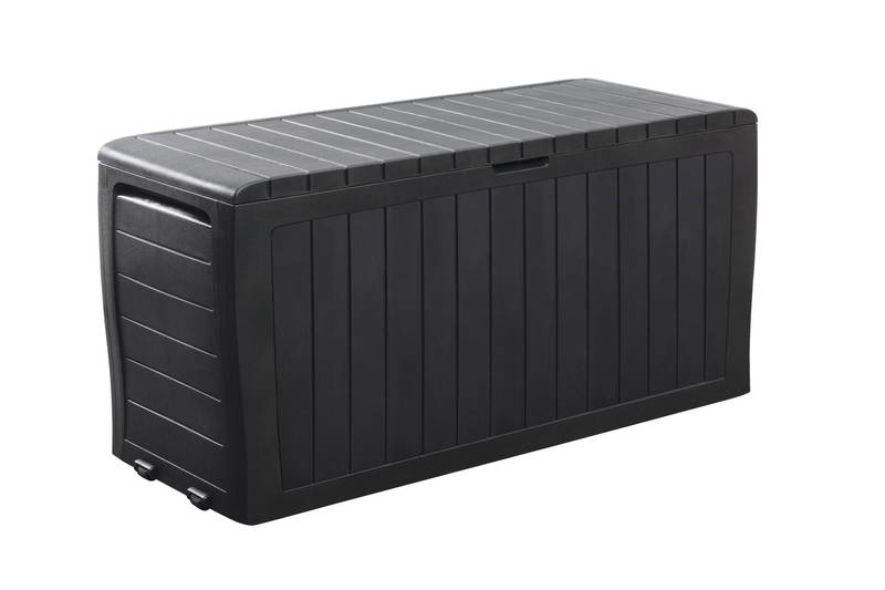 Berg eenvoudig al je tuinkussens, tuingereedschap of speelgoed op in de Marvel opbergbox van Keter. Deze kussenbox is gemaakt van weerbestendig kunststof en is voorzien van handgrepen en wieltjes, waardoor de box eenvoudig te verplaatsen is. Daarnaast kan de box afgesloten worden met een slotje (slot niet inbegrepen). De box heeft een inhoud van 270 liter. Hij kan goed tegen regenwater, maar is niet volledig waterdicht.